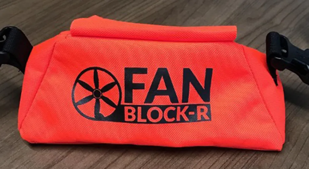 The Fan Block-R is an angled sandbag that can be used in multiple ways to prevent unwanted movement in fans and fan elements. Truettner calibrated the weight so that it can be placed on a fan’s blade to stop it from moving: “It weighs the exact weight needed to stop a 60-inch blade fan with a five mile-per-hour backdraft. Just the weight alone will stop it so you can just sit it in the path of the fan if you need to.”